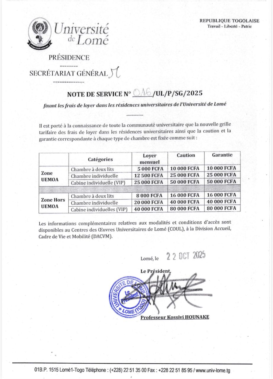 L’Université de Lomé vient de publier une nouvelle note de service fixant les frais de loyer, de caution et de garantie dans les résidences universitaires. Signée le 22 octobre 2025 par le Professeur Kossivi HOUNAKE, président de l’institution, cette décision marque une actualisation des tarifs applicables aux étudiants logés sur le campus.
