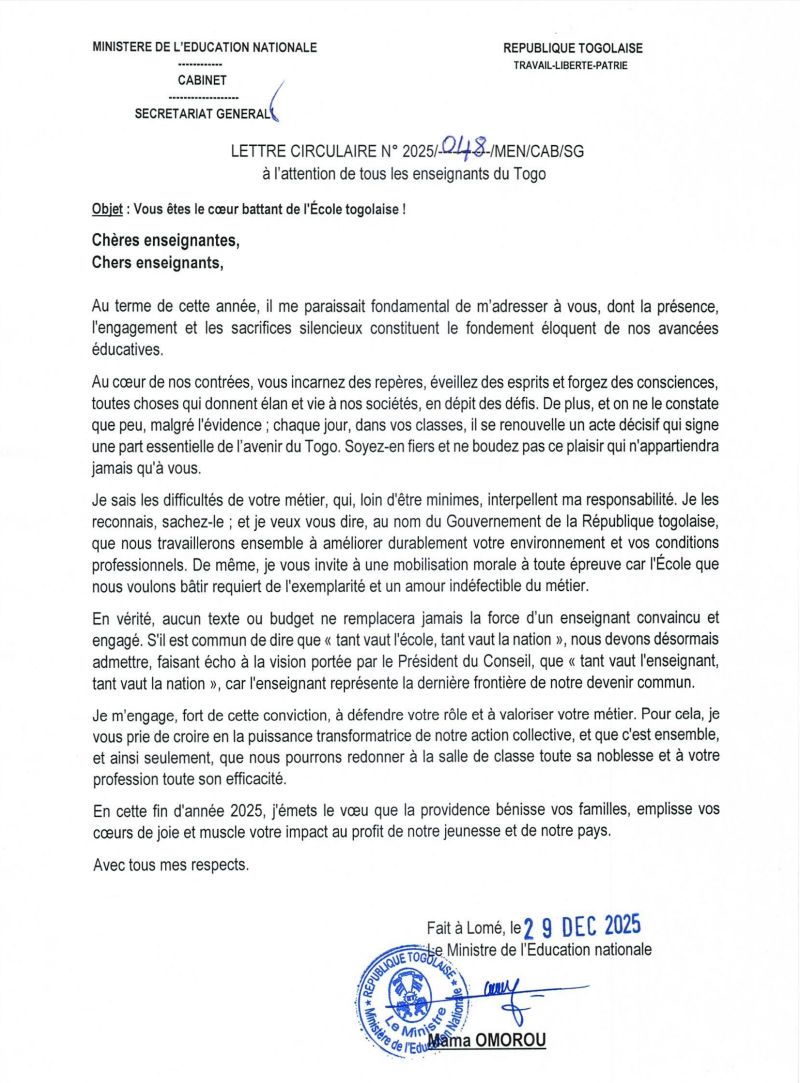 Le 29 décembre 2025, le Ministre de l’Éducation nationale du Togo, Mama Omorou, a signé une lettre circulaire adressée à tous les enseignants du pays. Ce texte, empreint de reconnaissance et de mobilisation, affirme une vérité fondamentale : les enseignants sont le cœur battant de l’École togolaise.