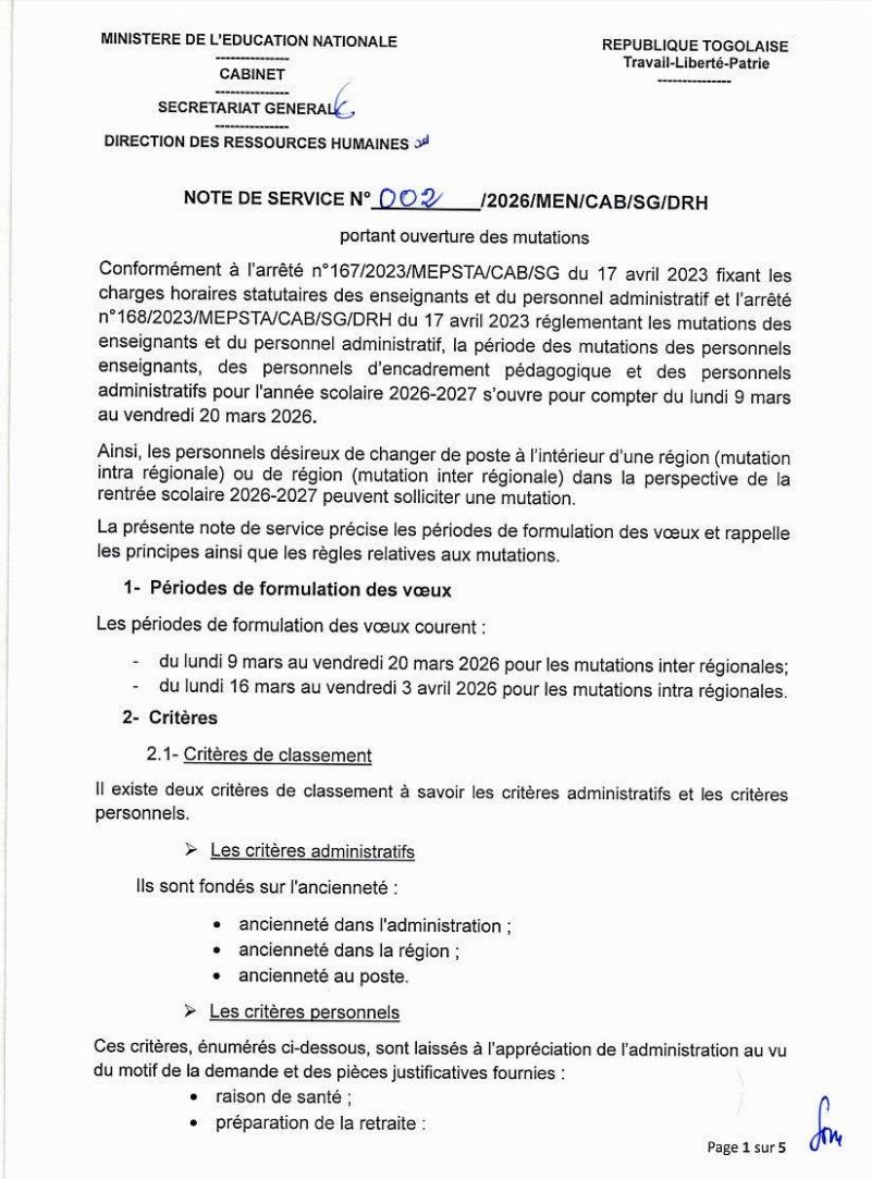 Le Ministère de l’Éducation nationale du Togo a publié la note de service N°002/2026/MEN/CAB/SG/DRH annonçant l’ouverture des mutations pour les enseignants, encadreurs pédagogiques et personnels administratifs. Cette mesure vise à garantir une répartition équitable des ressources humaines dans toutes les régions éducatives du pays, conformément aux arrêtés n°167 et n°168 du 17 avril 2023.