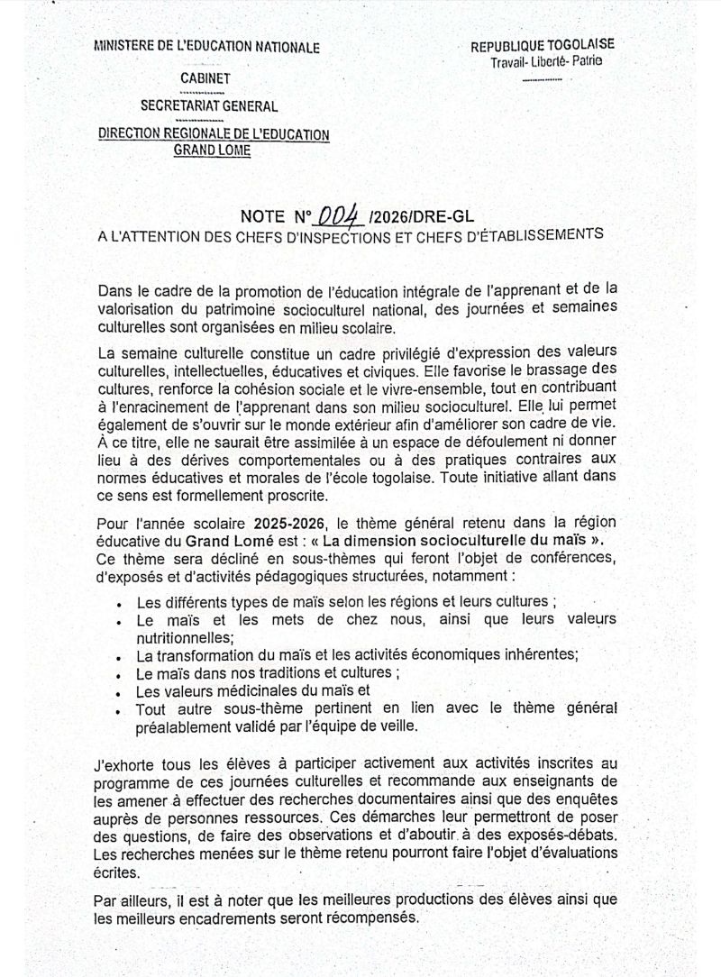 La Direction Régionale de l’Éducation du Grand Lomé lance la semaine culturelle 2026 autour du thème « La dimension socioculturelle du maïs ». Un événement éd...
