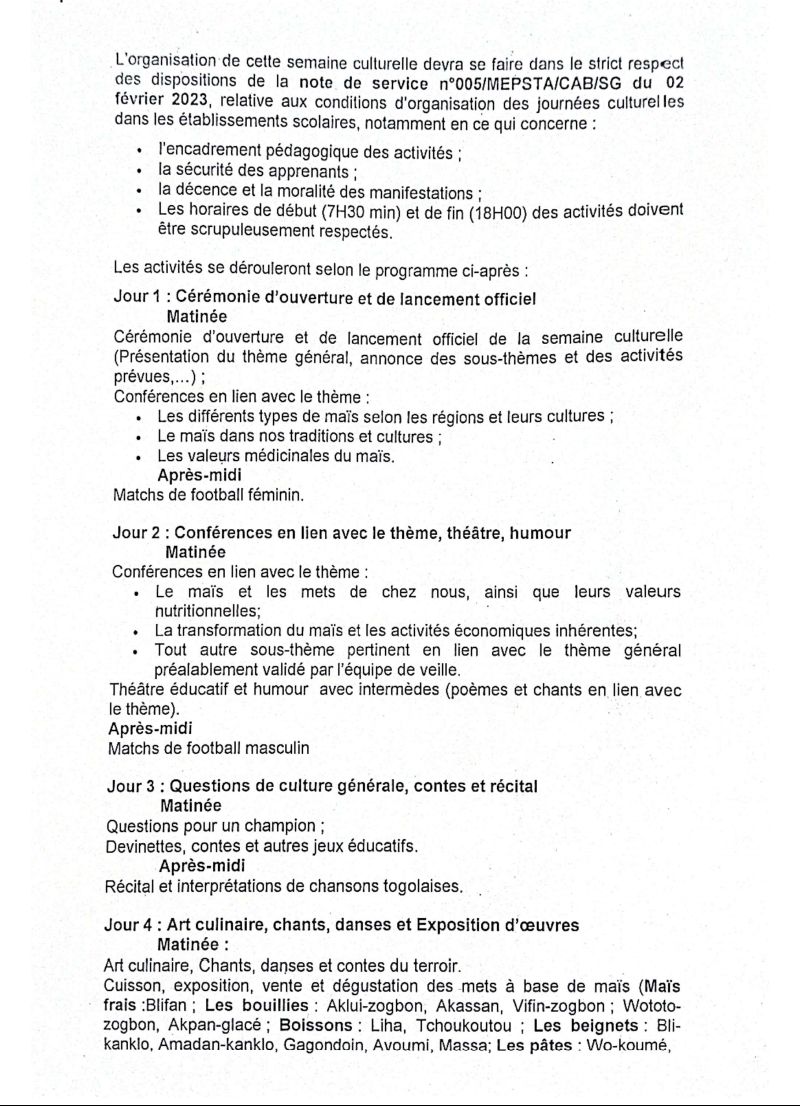 - Jour 4 : La journée mettra en avant l’art culinaire avec cuisson, exposition, vente et dégustation de mets à base de maïs. Les bouillies, boissons, beignets, pâtes et amuse-gueules typiques seront présentés. L’après-midi, les élèves exposeront des objets d’art, des dessins et des réalisations scientifiques.