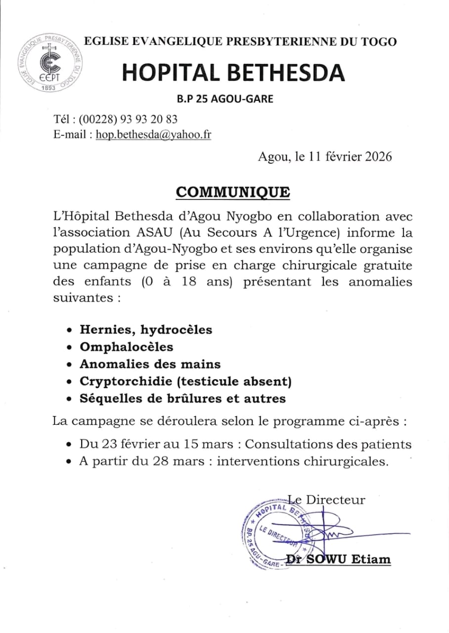 L’Hôpital Bethesda d’Agou Nyogbo lance une campagne humanitaire de chirurgie gratuite pour enfants de 0 à 18 ans. Hernies, hydrocèles, anomalies congénitales et séquelles de brûlures seront prises en charge. Consultations du 23 février au 15 mars 2026, interventions dès le 28 mars.
