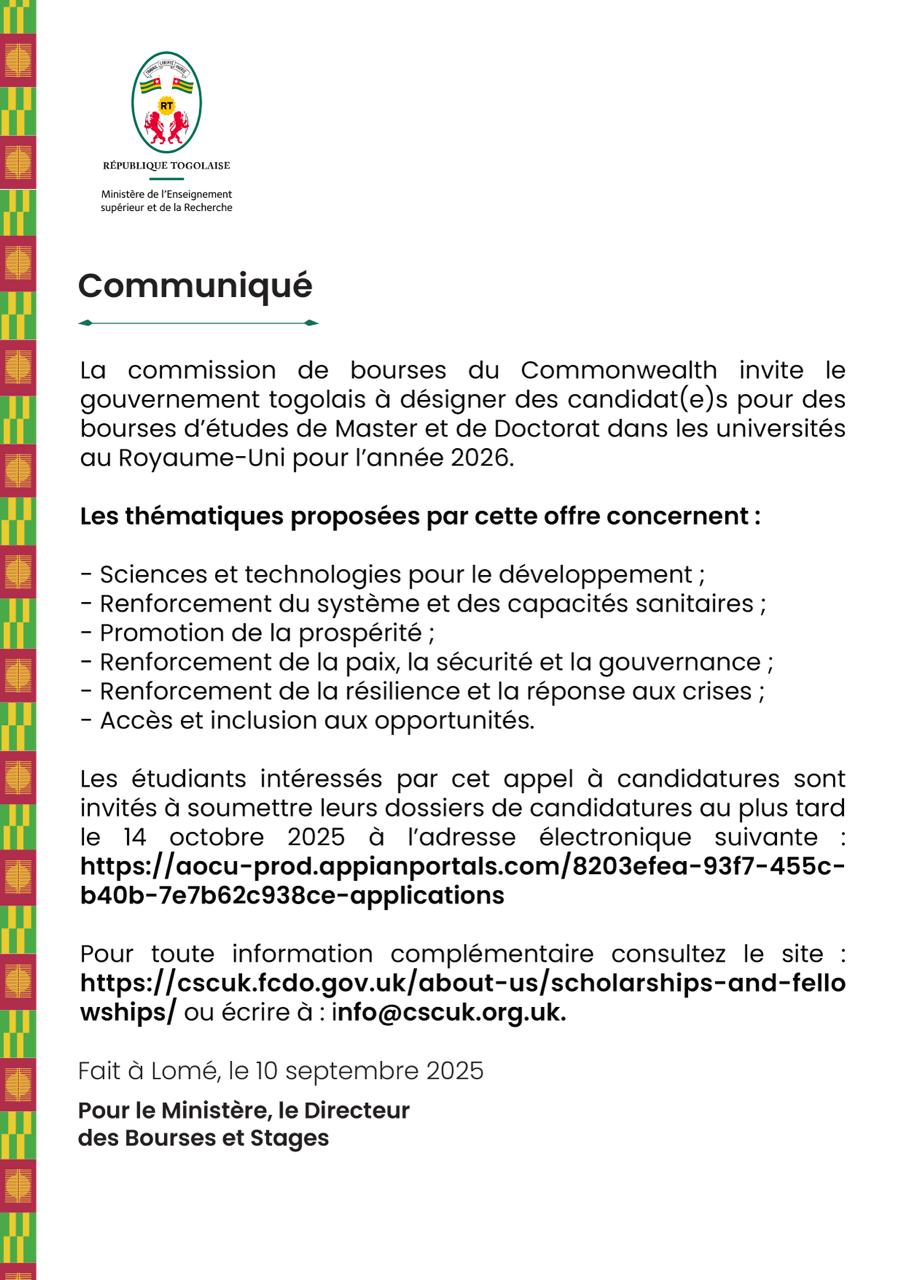 Le gouvernement togolais, à travers le ministère de l’Enseignement supérieur et de la Recherche, invite les étudiants togolais à soumettre leurs dossiers pour les prestigieuses bourses d’études du Commonwealth. Ces bourses sont destinées aux études de Master et de Doctorat dans les universités du Royaume-Uni pour l’année académique 2026.