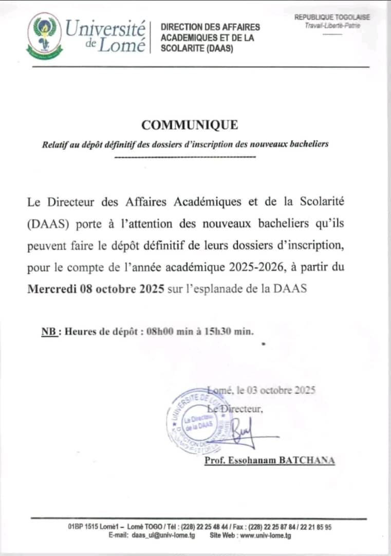 La Direction des Affaires Académiques et de la Scolarité (DAAS) de l’Université de Lomé informe les nouveaux bacheliers 2025 que le dépôt définitif des dossiers d’inscription débutera à partir du mercredi 08 octobre 2025, sur l’esplanade de la DAAS.